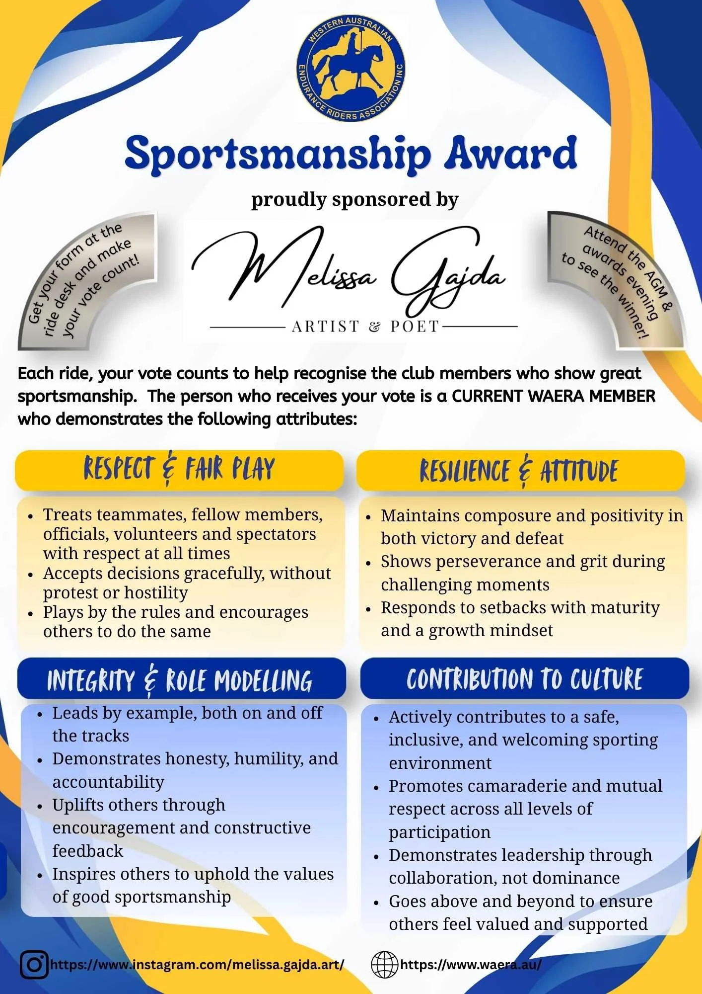 Voting for the Sportsmanship award 2026 is now open - make sure you lodge your voting slips at each ride you attend. Use the information in the flier to help you identify our next Sportsman of the year. Any questions, please contact the SMC.